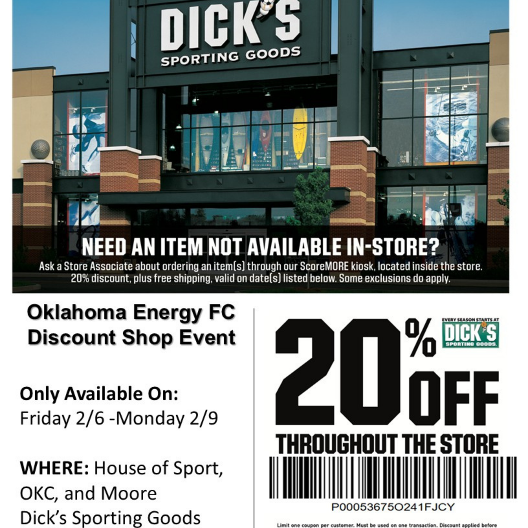 We’re excited to share that our partner, Dick’s Sporting Goods, will be hosting an exclusive 20% off discount shop event for Oklahoma Energy FC families!